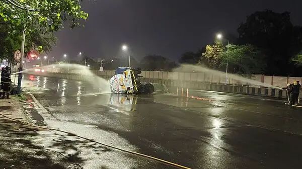 दरम्यान, हा टँकर रात्री ३ च्या सुमारास वडगाव शेरी चौकात आला असता. टँकर चालकाचे टँकरवरील नियंत्रण सुटल्याने मोठ्या प्रमाणात वायु गळती होण्यास सुरुवात झाली. या गळती मुळे रस्त्यावर पूर्ण गॅस पसरला होता. ही गॅस ज्वलनशील असल्याने मोठ्या स्फोट होण्याची भीती होती. अपघाताची माहिती मिळताच अग्निशामक दलाचे तब्बल ८ बंब तातडीने घटनास्थळी रवाना झाले.रिलायंस पेट्रोकैमिकल्स कंपनीची मदत येईपर्यंत धोका लक्षात घेऊन टँकरवर पाण्याचे स्प्रे मारणे सुरु आहे. या अपघातामुळे या मार्गावरील वाहतूक ठप्प झाली आहे. पोलिस विभागातर्फे या मार्गावरील वाहतुक नियंञित करण्याचे काम सुरू करण्यात आले आहे. वृत्त लिहोत्सव गॅस गळती ही थांबलेली नव्हती. तसेच कंपनीचे अधिकारी देखील घटनास्थळी दाखल झाले नव्हते.