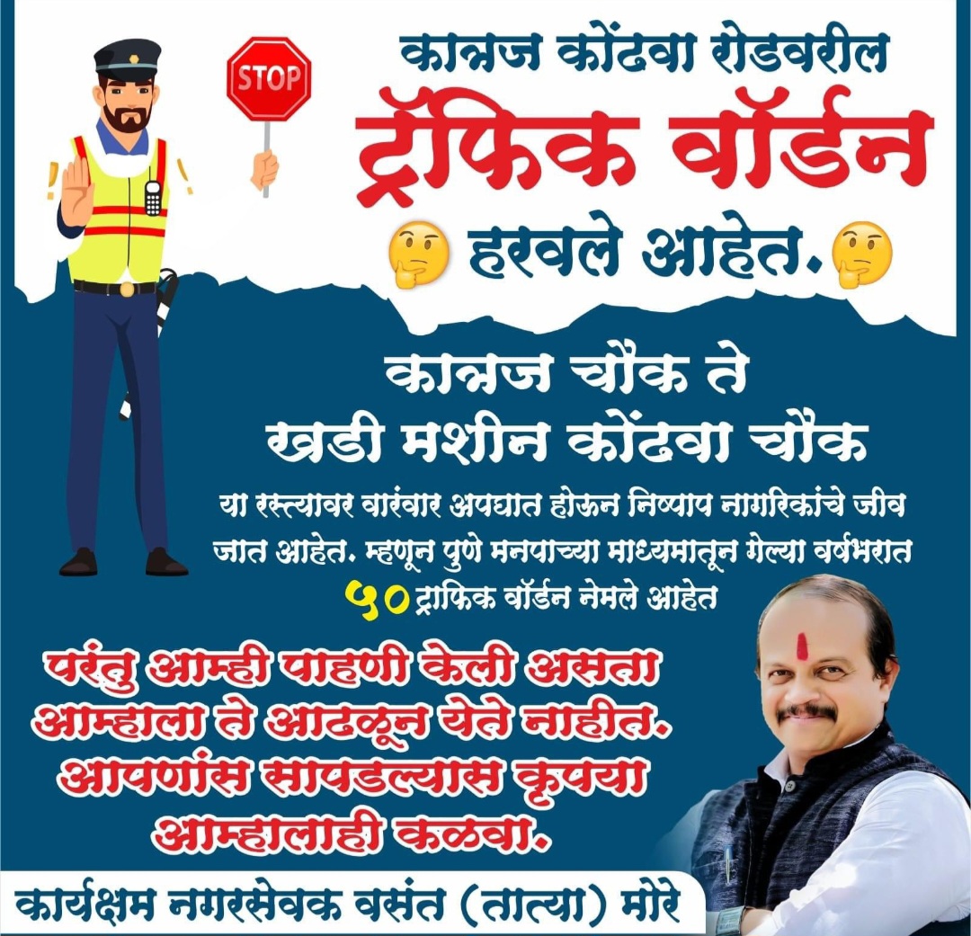 कात्रज कोंढवा रस्त्यावरती लावण्यात आलेल्या पोस्टरमध्ये ट्राफिक वॉर्डन हरवले आहेत असं ठळकपणे लिहिलं आहे. तसेच कात्रज चौक ते खडी मशीन कोंढवा चौक या रस्त्यावर वारंवार अपघात होऊन निष्पाप नागरिकांचे जीव जात आहेत.म्हणून पुणे मनपाच्या माध्यमातून गेल्या वर्षभरात 50 ट्राफिक वॉर्डन नेमले आहेत परंतू, आम्ही पाहणी केली असता आम्हाला ते आढळून येते नाहीत.आपणांस सापडल्यास कृपया आम्हालाही कळवा. असं या पोस्टरवर म्हंटलं आहे.यावर वसंत मोरे यांनी सोशल मीडियावर पोस्ट देखील केली आहे. या पोस्ट मध्ये मोरे म्हणतात, बहुचर्चित कात्रज कोंढवा रोडवरील कात्रज चौक ते कोंढवा खडी मशीन चौक या रस्त्यावर गेल्या वर्षभरापासून उपाय केले जात आहेत.