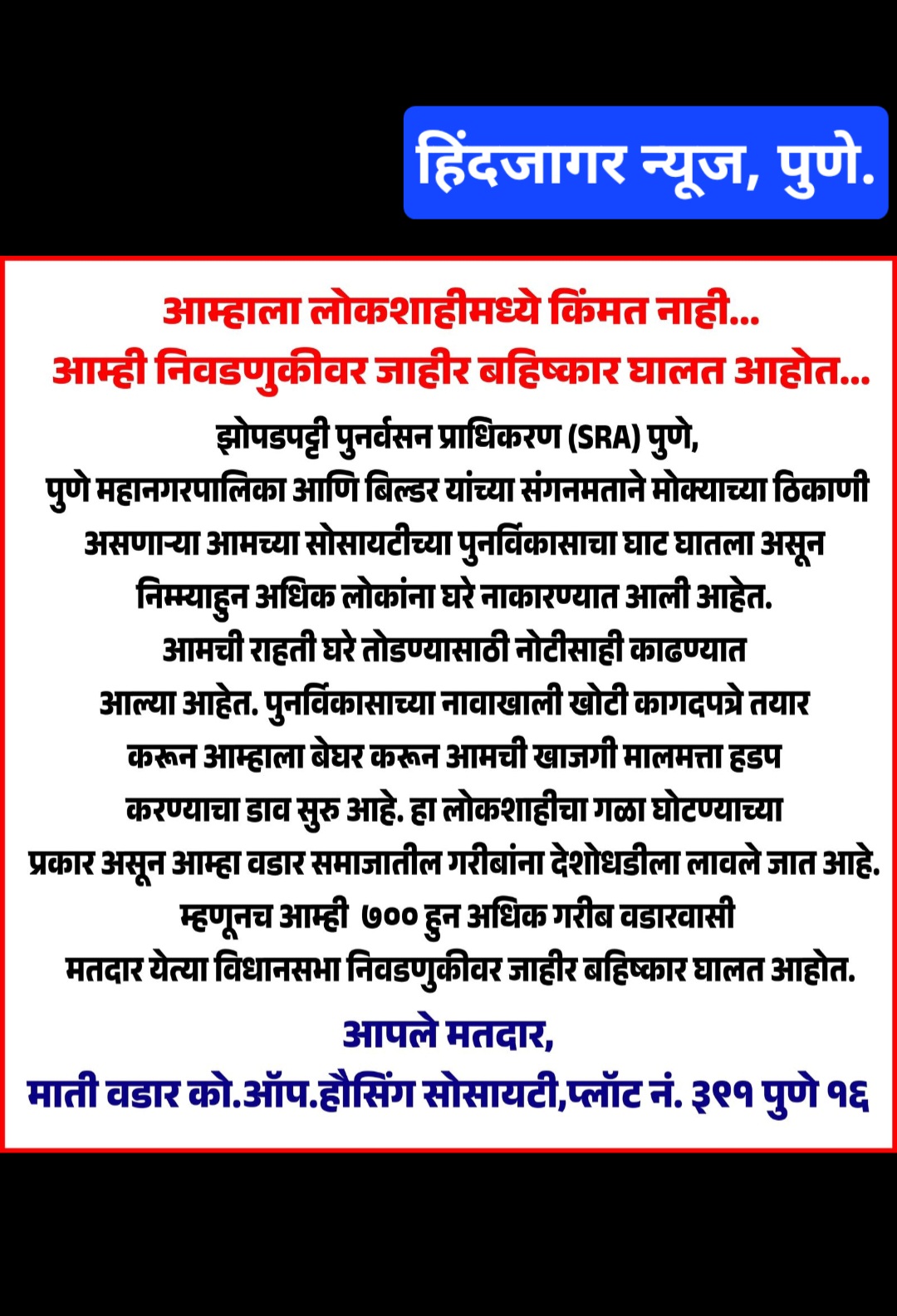 पुणे महानगरपालिका आणि बिल्डर यांच्या संगनमताने आमची राहती घरे तोडण्यासाठी नोटीसाही काढण्यात आल्या आहेत असे आरोप राजेश जाधव यांनी पुढे केले.आम्हाला लोकशाहीमध्ये किंमत नाही.आम्ही निवडणुकीवर जाहीर बहिष्कार घालत आहात… पुनरविकासाच्या नावाखाली खोटीकागदप्रेतयार करून आम्हाला बेघर करून आमची खाजगी मालमत्ता हडपक रण्याचा डाव आहेः हा लाकशाहाचा गळा घोटण्याच्या प्रकार असून आ्हा वडार समाजातील गरीबांना देशोधडीला लावले जात आहे.म्हणूनच आम्ही ७०० हुन अधिक गरीब वडारासी मतदार येत्या विधानसभा निवडणुकीवर जाहीर बहिष्कार घालत आहोत अशा तीव्र शब्दात विरोध केला आहे तसेच येणाऱ्या विधानसभा निवडणुकीवर बहिष्कार टाकत असल्याचे निवेदन जिल्हाधिकारी यांना देण्यात येणार आहे.