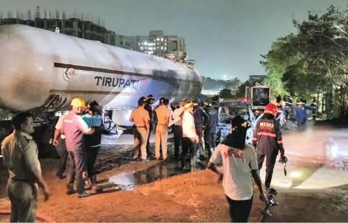 रस्त्यावर मोठी गर्दी गोळा झाली असून अग्निशमन दलाने आग आटोक्यात आणली आहे. दरम्यान, मोठया गॅस टँकर आणि व्यावसायिक वापराच्या सिलिंडरमधून गॅस चोरीचा प्रयत्न होत असताना ही घटना घडल्याचा प्राथमिक अंदाज आहे. घटनास्थळावरून टँकर चालक पसार झाला आहे.